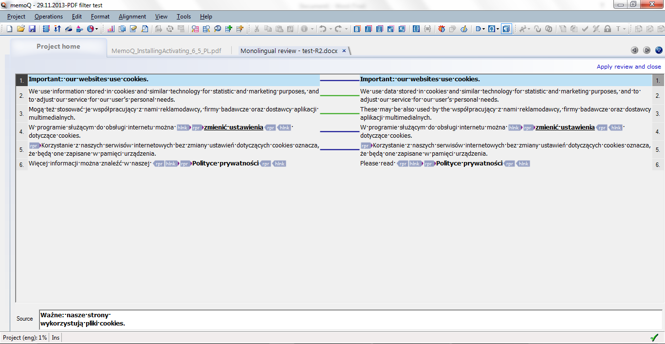 I believe that this filter is very important for the marketing purposes. So far, memoQ could import text from PDF documents, and save the translated text into a .txt file. Now, it tries to restore the initial formatting of the source PDF. I say “tries” on purpose. No automatic conversion will give satisfactory results for PDF conversion. So why is it important? Studio does it, Wordfast PRO does it, now memoQ also does it. Simple as that.