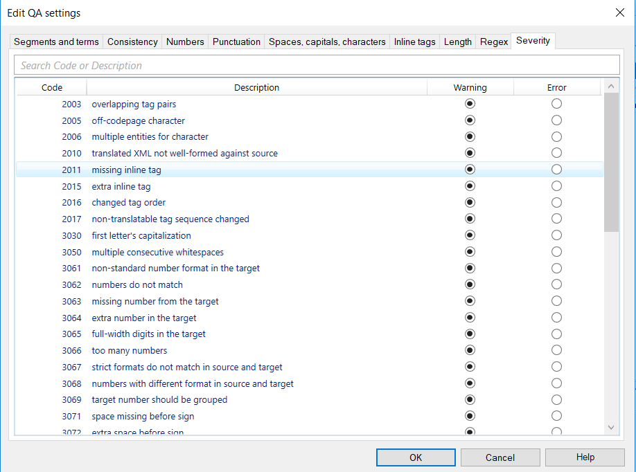 O tej funkcji napiszemy osobno, bo jest wyjątkowo ciekawa i oczekiwana. W memoQ 8.1 można samodzielnie zmieniać kategorie komunikatów QA – z warning na error. Opcja ta jest szczególnie ciekawa dla użytkowników memoQ server. Możliwe jest bowiem zablokowanie opcji dostarczania projektu, gdy w tekście QA wykryje błędy (errors).