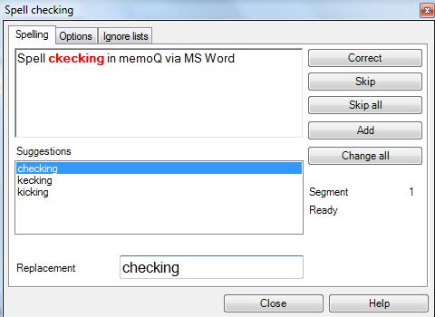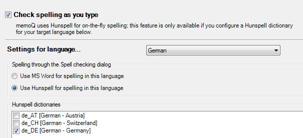 Sprawdzanie pisowni odgrywa znaczącą rolę w podczas tłumaczenia. Podczas pracy z memoQ mamy możliwość sprawdzania poprawności wpisywanych wyrazów na bieżąco, a także już po zakończeniu tłumaczenia. Do sprawdzania pisowni na bieżąco służy słownik udostępniany na zasadach licencji otwartej, Hunspell, do sprawdzania już przetłumaczonych treści możemy wykorzystać mechanizm wbudowany w MS Word.